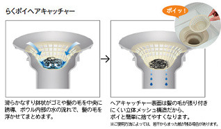 髪の毛等も簡単に中央に誘導する、ラクポイヘアキャッチャーを装備。また排水口の間口が従来より広くシンプルなのでお掃除の手間も省いてくれます。